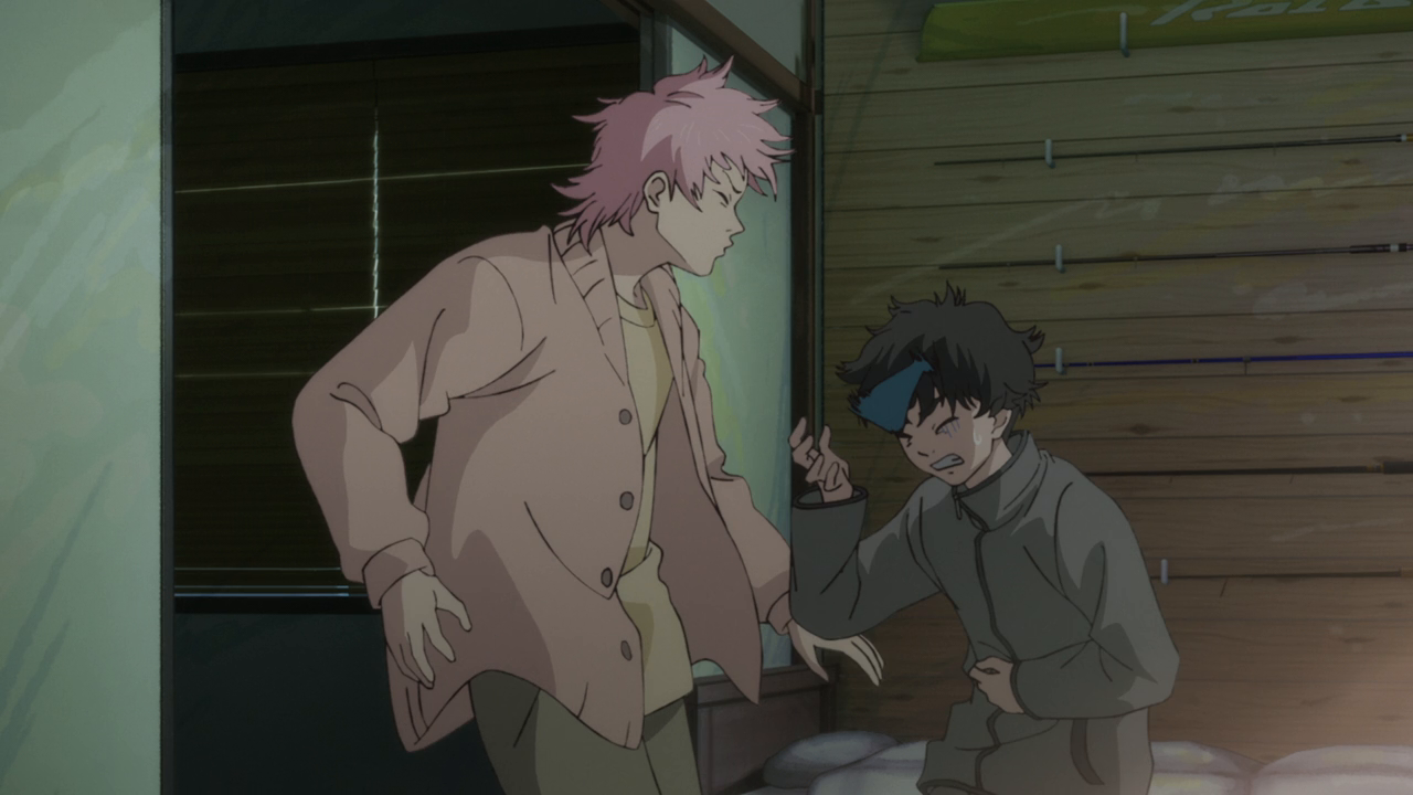 spot Tsunehiro and pull him to safety. Before returning, they anchor offshore to fish and