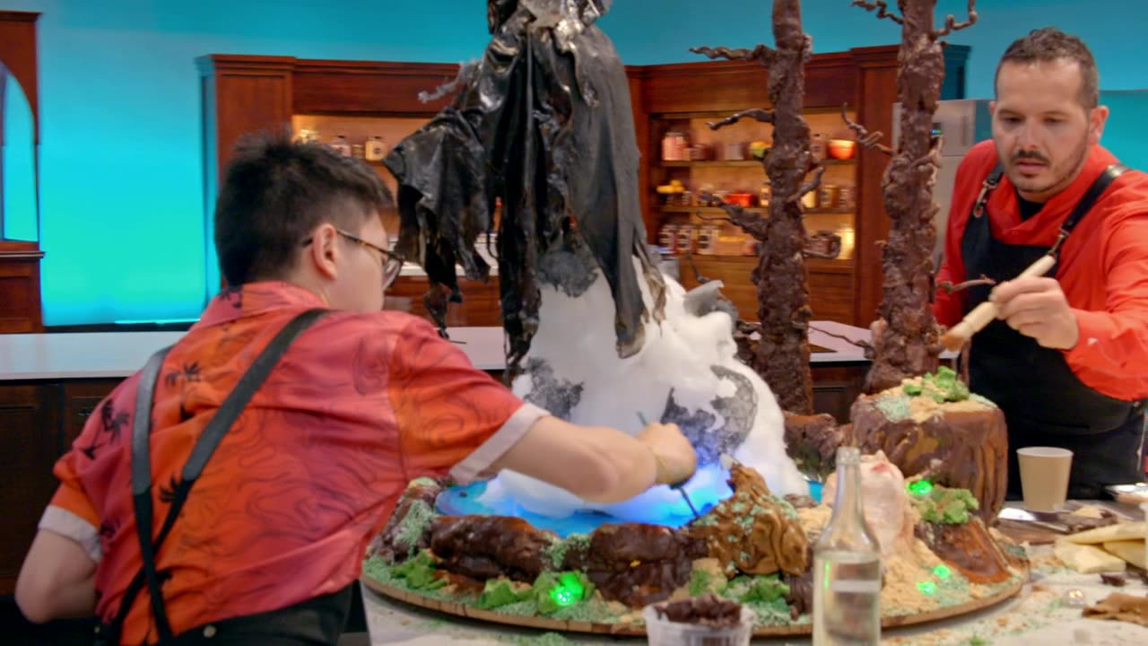It's the semi-finals, and the remaining teams must draw inspiration from the office of headmaster Albus Dumbledore's office, which houses many iconic items from Harry Potter lore. And since the office is also home to Fawkes the Phoenix, hosts James and Oliver Phelps request that part of each team's 4-foot-tall showpiece should appear to be transforming from one thing to another. Plus, the tasting elements must highlight two of the four pillars of flavor: sweet, sour, spicy and salty. Harry Potter alumna Bonnie Wright joins judges Carla Hall and Jozef Youssef to decide which teams will go on to the final showdown.