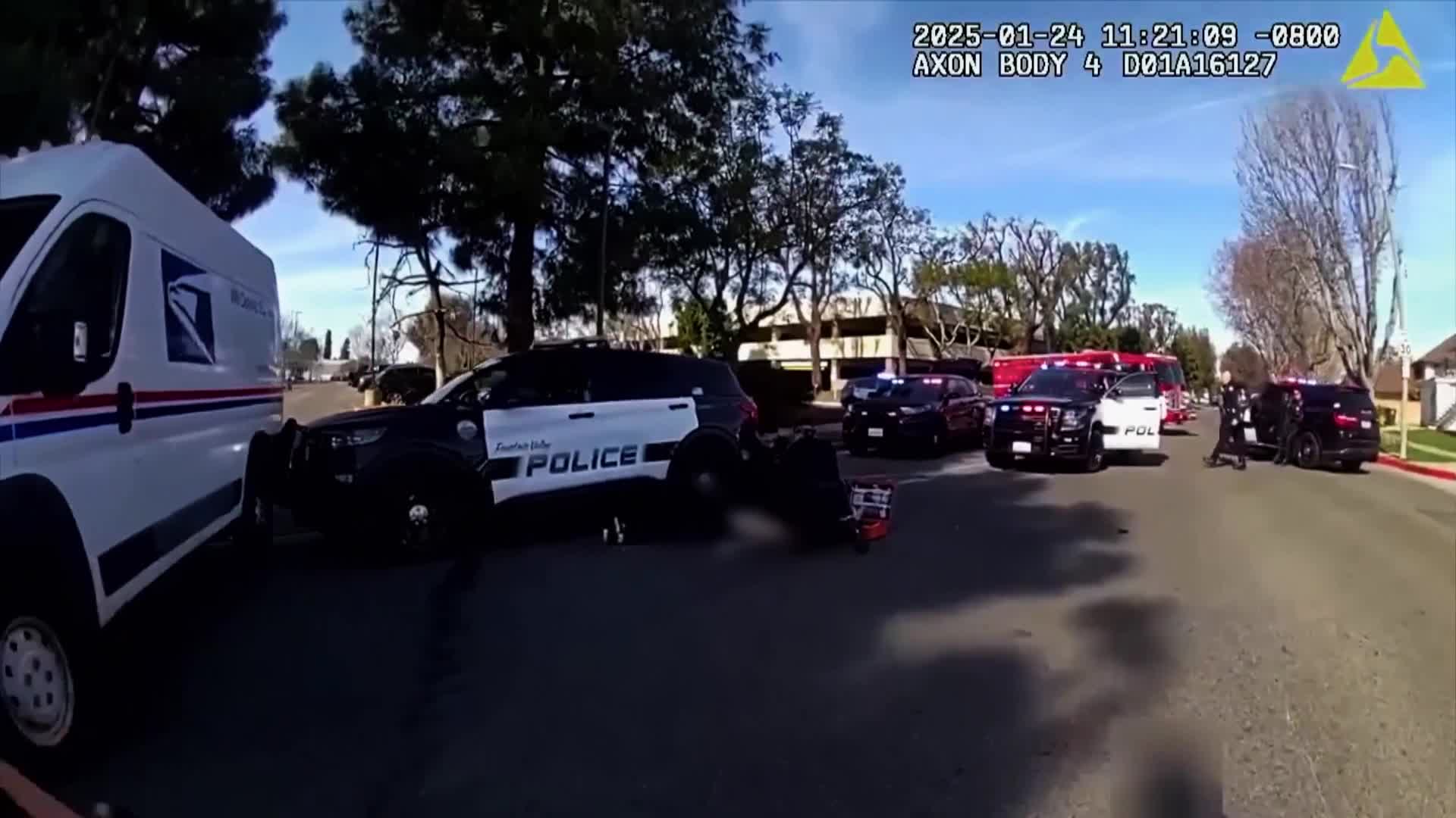Law enforcement officers pursue fugitives on the run. A getaway driver smashes into 3 police cruisers and a bystander's S-U-V while leading officers on a high-speed, parking lot chase; and more.