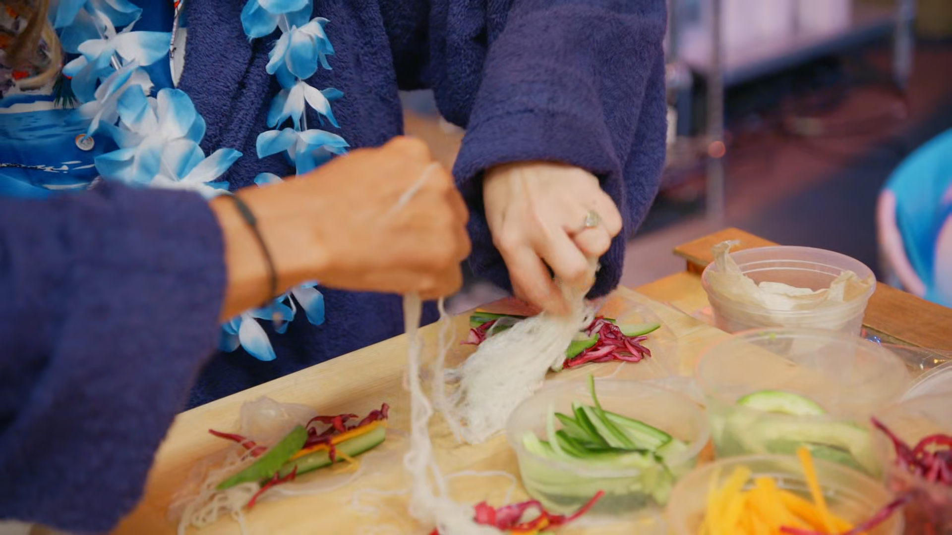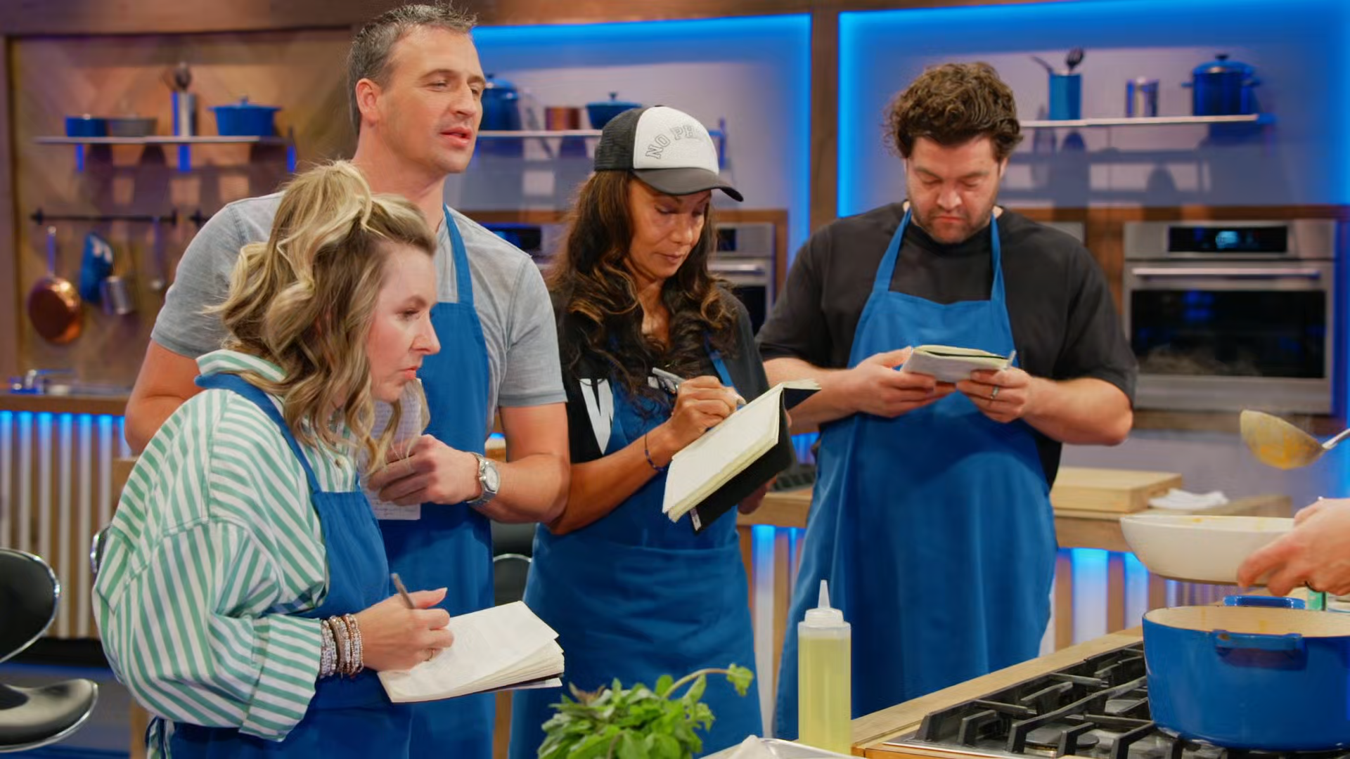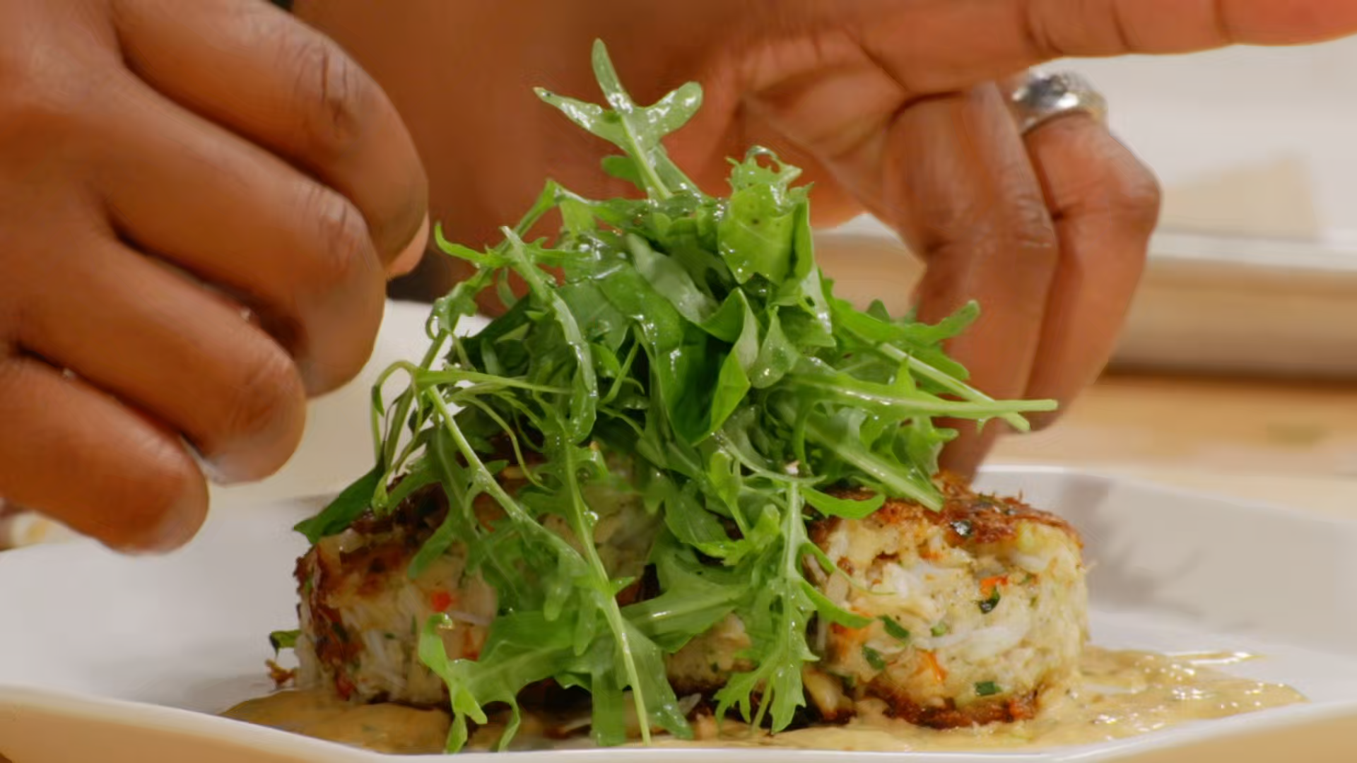 The celebrity teams hustle during a head-to-head relay race through a faux-luxury resort to create poolside platters; then, chefs Jeff Mauro and Tiffany Derry challenge them to make crab cakes and seafood curry.