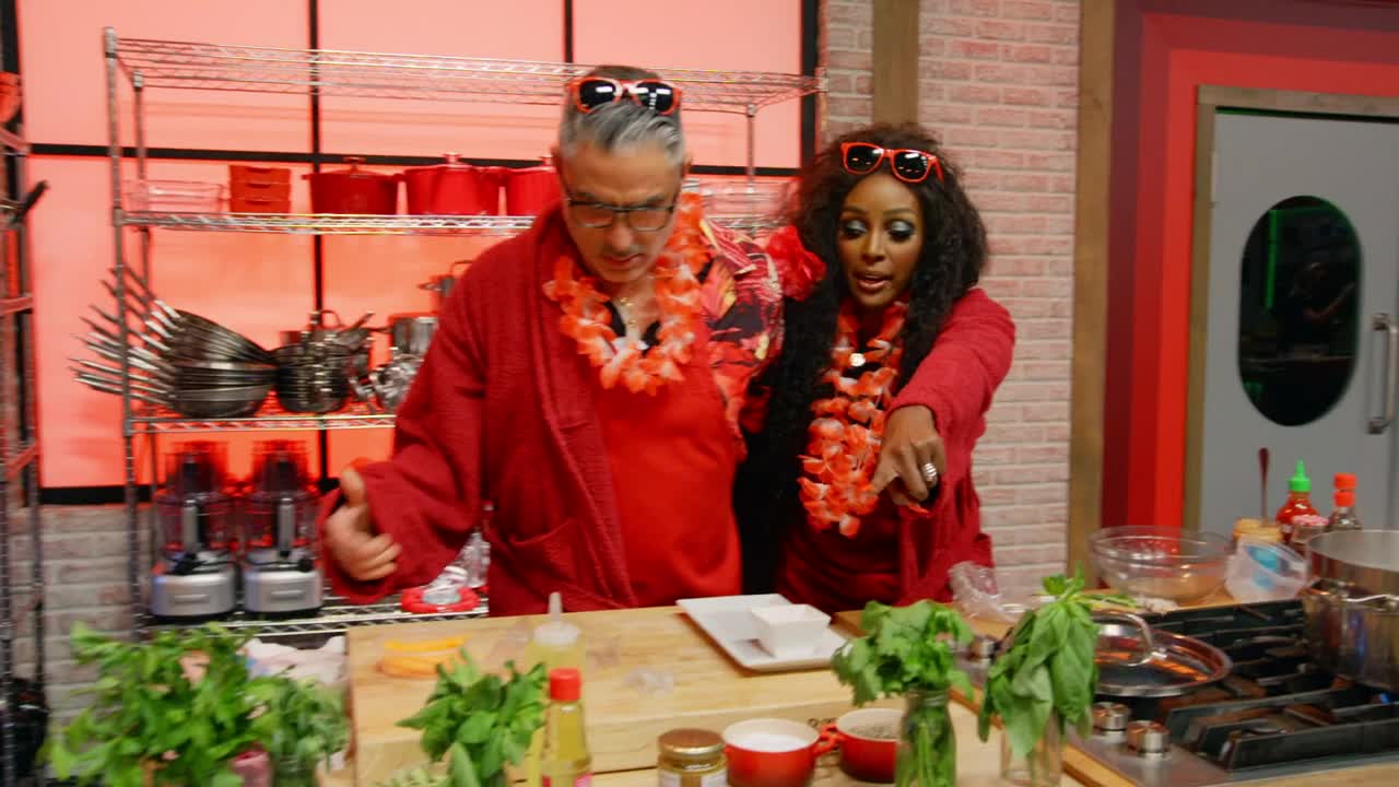The celebrity teams hustle during a head-to-head relay race through a faux-luxury resort to create poolside platters; then, chefs Jeff Mauro and Tiffany Derry challenge them to make crab cakes and seafood curry.