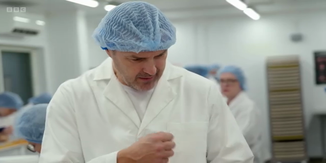The merriment begins outside at the intake area with a delivery of the all-important ground ginger, where Paddy meets managing director Gemma Williams. Then, with a sprinkle of Christmas magic, Paddy and Gemma appear in the mixing area – hair nets on – ready to mix a batch of biscuits. Paddy learns that two types of sugar are used, demerara for a caramelised flavour and granulated sugar for a neutral sweetness. Then, in goes a mix of vegetable oils called shortening, bicarbonate of soda to help the biscuits rise a little and, of course, the ground ginger. They're followed by flour, golden syrup and water before being mixed together to create gingerbread dough.