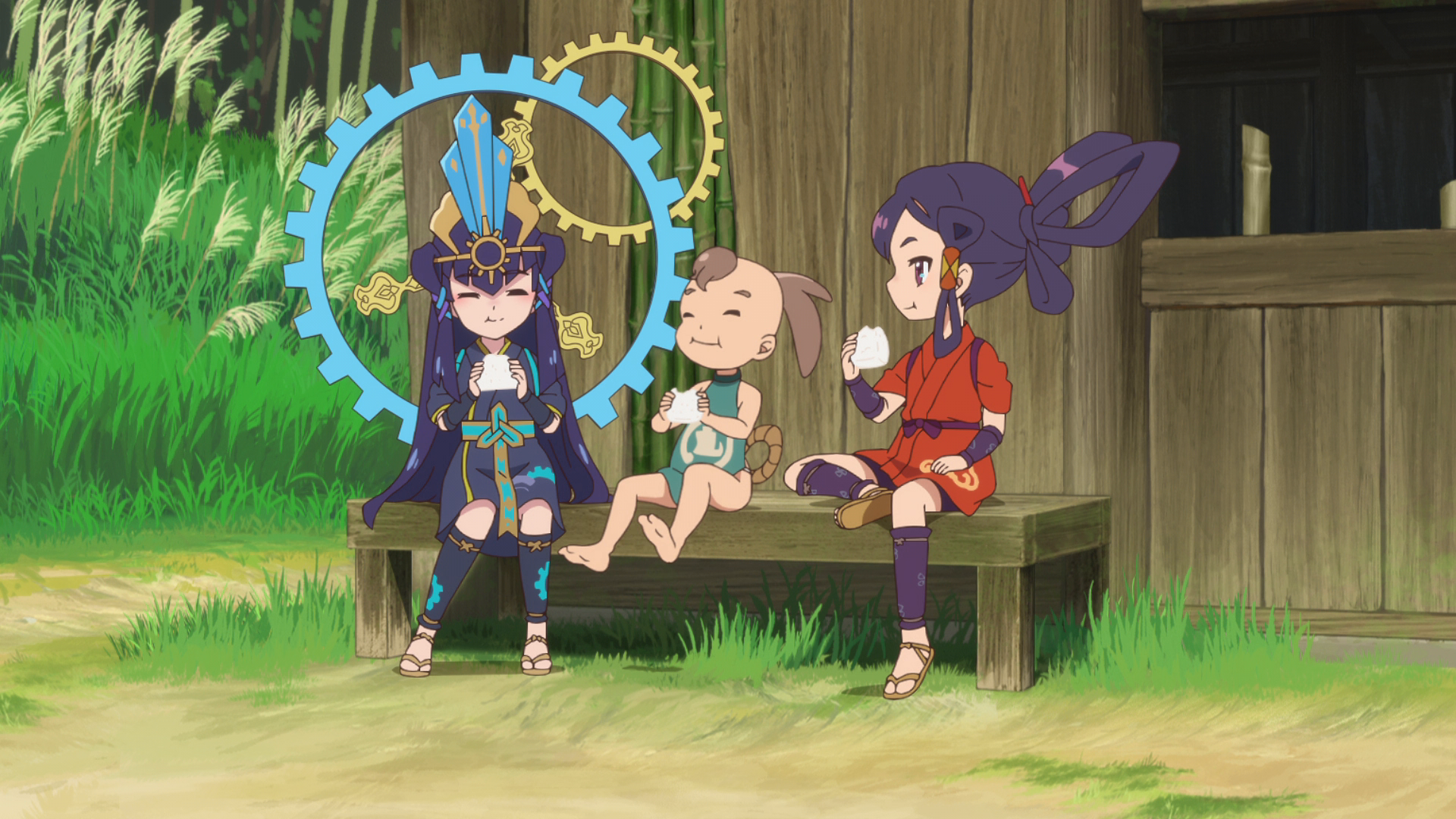 elements, fighting monsters, and cultivating rice, the source of her power. By her side in